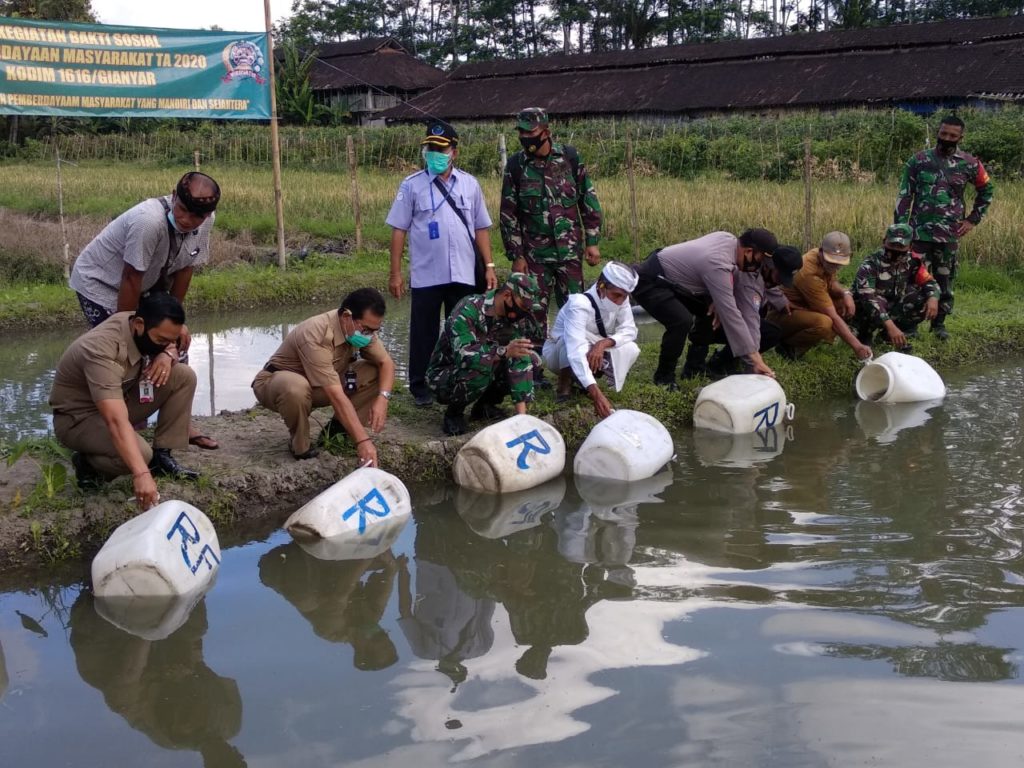 Patrolibali.com (Gianyar) Kodim 1616/Gianyar terus berupaya untuk mendukung program pemerintah dalam meningkatkan ketahanan pangan. Kali ini Kodim 1616/Ganyar bekerja sama dengan Banjar Batur Sari, Lingkungan Batur Sari, Kelurahan Bitera, Gianyar mengembangkan budidaya perikanan dengan menebar benih ikan lele sejumlah 40 ribu ekor, Senin (14/09/2020).