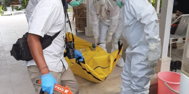 Petugas di TKP saat mengevakuasi Jasad korban mengenakan APD lengkap.