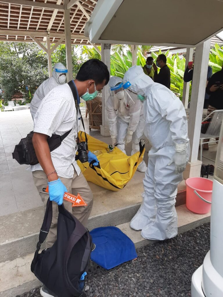 Pukul 13.11 Wita petugas Identifikasi Polres Badung tiba di sana dan langsung melakukan olah TKP. Hasil pemeriksaan petugas medis Puskesmas Kuta Utara tidak ditemukan tanda-tanda kekerasan. Untuk tahu sebab dan waktu meninggalnya baru bisa diketahui setelah melakukan autopsi. Sekitar 1 jam kemudian, datang ambulans Palang Merah Indonesia Kabupaten Badung. Petugas menggenakan APD lengkap mengevakuasi mayat korban dan dibawa ke RSUP Sanglah.