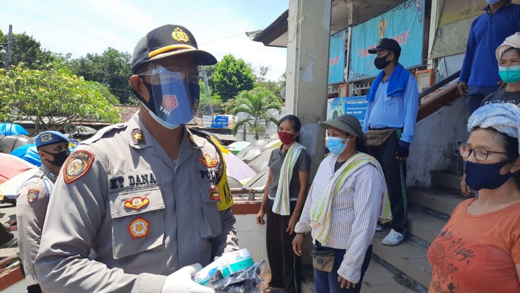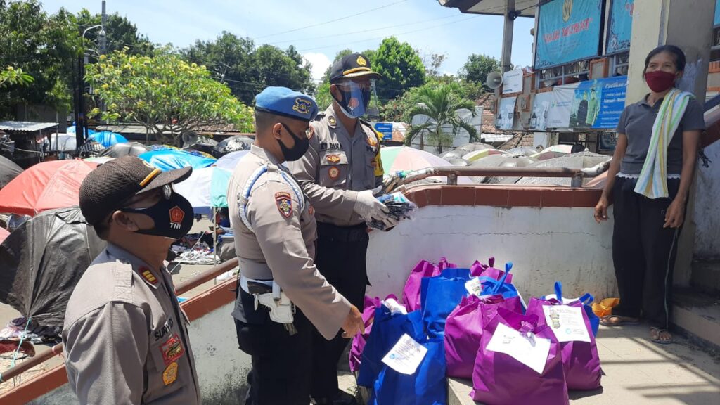 Patrolibali.Com (Gianyar) Kepolisian Resor Gianyar melakukan bakti sosial (baksos) peduli warga terdampak pandemi virus Corona (COVID-19) dengan membagikan sembako dan masker kepada juru parkir dan buruh Pasar Sukawati, Sabtu (3/10/2020).