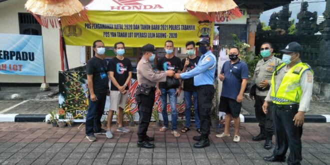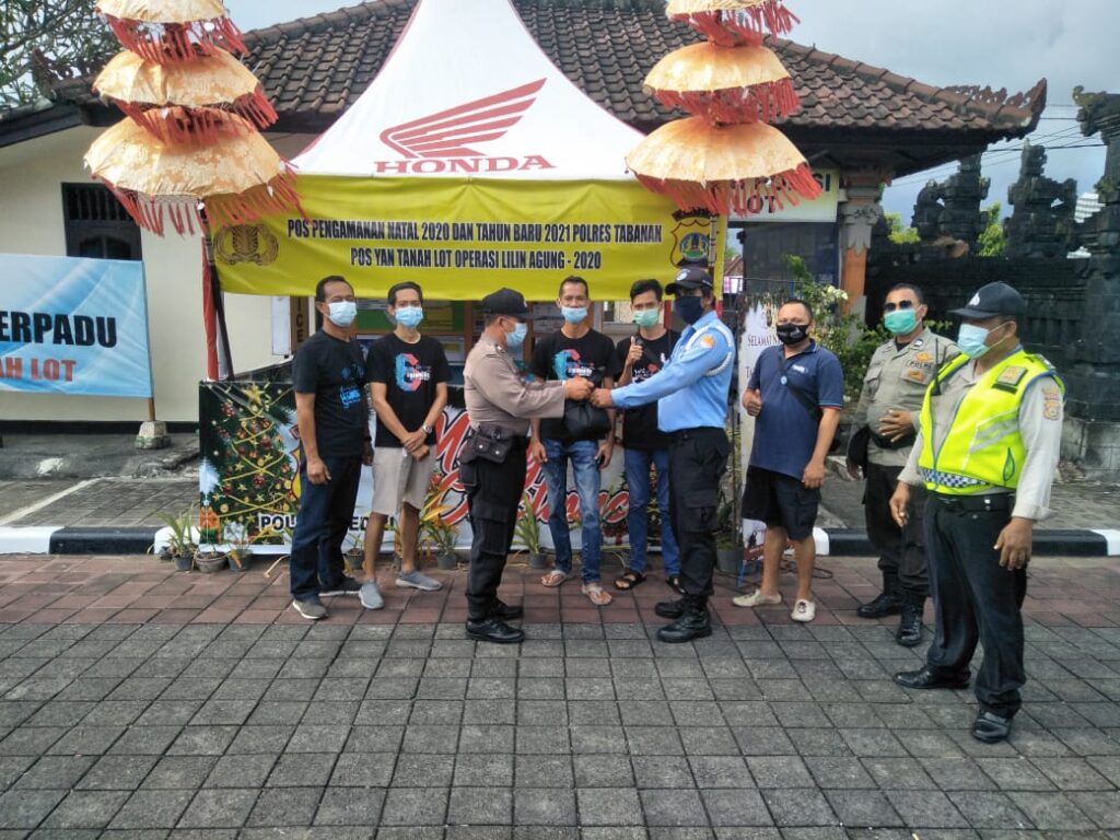 Patrolibali.com (Tabanan) Untuk meringankan beban masyarakat pada Pasca Pandemi Covid19 ini, dan juga sebagai wujud penghargaan kepada para petugas Keamanan yang bertugas di Kawasan Wisata Tanah Lot, Kapolsek Kediri Kompol I Gusti Nyoman Wintara S.H, seijin Kapolres Tabanan AKBP Mariochristy P.S., Siregar S.I.K., M.H., pada hari Minggu tanggal 27 Desember 2020 pukul 15.30 Wita bertempat di Pos Pelayanan Pengamanan Natal dan Tanah lot, Kediri Kabupaten Tabanan Telah menyerahkan Bantuan 30 bungkus sembako yang berisikan beras, gula pasir, Minyak goreng, dan handsanistazer. Bingkisan Dari komunitas Mobil Tua diserahkan kepada Scurity Dtw Tanah lot oleh Kanit Sabhara Polsek Kediri mewakili Kapolsek Kediri.
