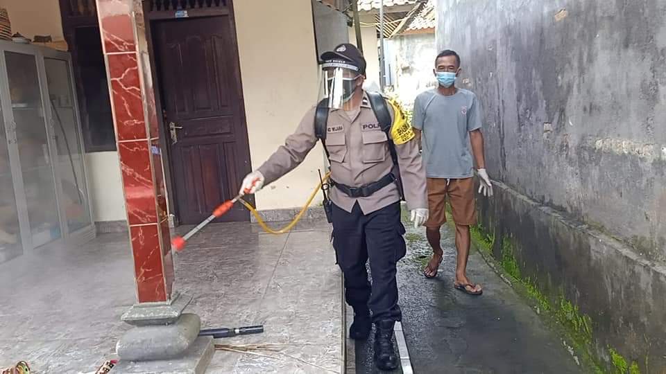 Giat Prokes meliputi Penyemprotan Desinfektan Yang Di Laksanakan Langsung Oleh Bhabinkamtibmas Desa Kelusa AIPTU I Made Wijana Bersama Tim Satgas Terpadu Covid 19 Desa Tangguh Dewata Desa Kelusa.