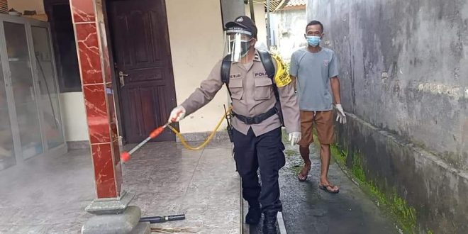Giat Prokes meliputi Penyemprotan Desinfektan Yang Di Laksanakan Langsung Oleh Bhabinkamtibmas Desa Kelusa AIPTU I Made Wijana Bersama Tim Satgas Terpadu Covid 19 Desa Tangguh Dewata Desa Kelusa.