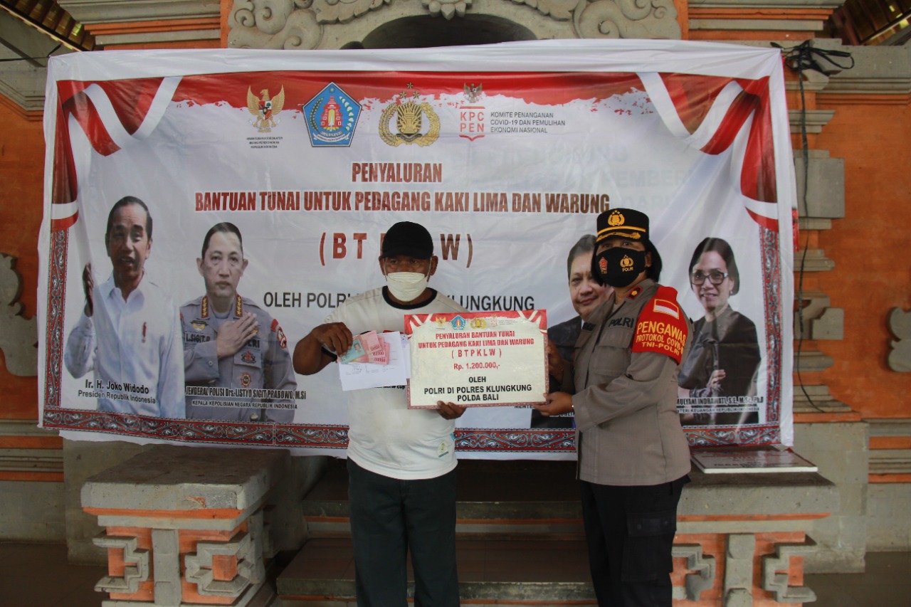 Polres Klungkung menyalurkan Bantuan Tunai untuk Pedagang Kaki Lima dan Warung (BTPKLW) senilai Rp 1.200.000,- (satu juta dua ratus ribu rupiah) kepada setiap pedang kaki lima (PKL) dan warung di Kabupaten Klungkung bertempat di Balai Budaya Ida I Dewa Agung Istri Kanya.