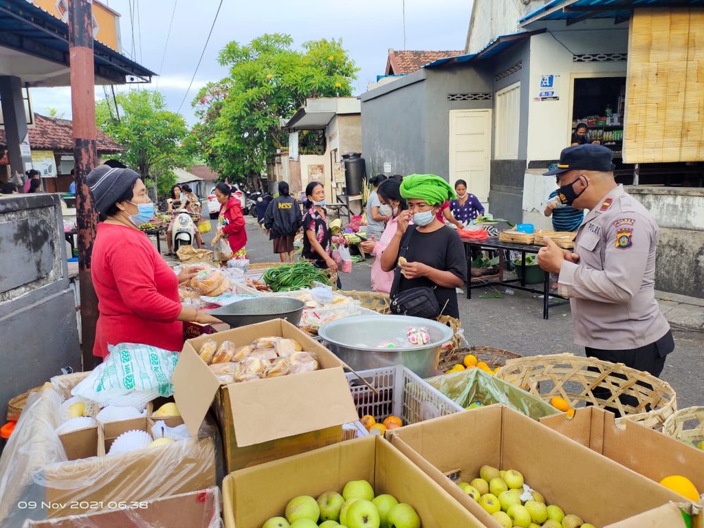 Patrolibali.com (Klungkung) Demi mencegah terjadinya tindak kriminal dan penularan virus covid-19 di wilayah Kecamatan Dawan , Kanit Binmas bersama dengan Personel Bhabinkamtibmas melaksanakan kegiatan Binluh dan Sambang Desa Di Pasar Tradisional Desa Sampalan. Selasa Pagi, 09/11/2021