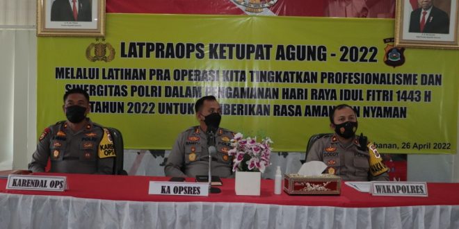Pada hari Selasa tanggal 26 April 2022 Pukul 08.00 sampai dengan 10.00 Wita bertempat di Aula Wisnu Hartono Polres Tabanan telah berlangsung Latihan Pra Operasi Ketupat Agung 2022 yang dibuka oleh Kapolres Tabanan AKBP Ranefli Dian Candra, S.I.K., M.H., Latihan Pra Operasi Ketupat Agung 2022 Polres Tabanan berlangsung setelah sebelumnya untuk jajaran Polda Bali berlangsung upacara pembukaan melalui zoom meeting yang dipimpin Waka Polda Bali Brigjen. Pol. Drs. I Ketut Suardana, M.Si.