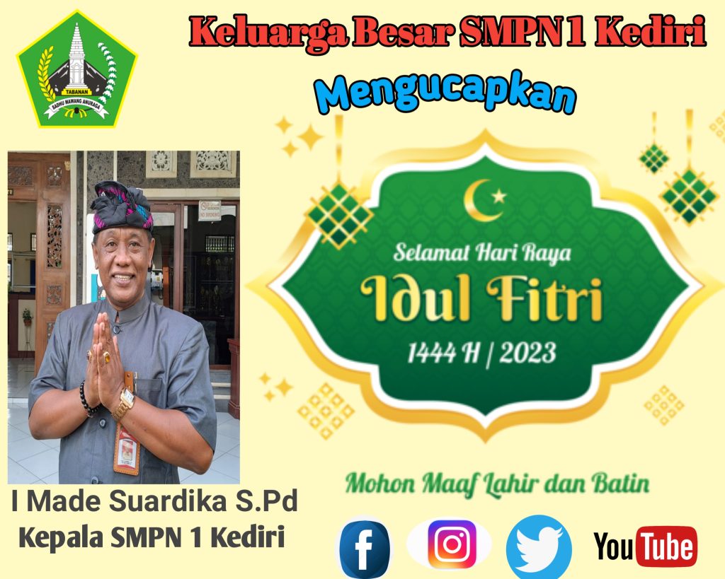 SMP Negeri 1 Kediri Mengucapkan Selamat Hari Raya Idul Fitri 1444 H / 2023. Rudi April 1, 2023 BERITA, PENDIDIKAN Leave a comment 18 Views Related Articles Selamat Hari Raya Galungan Dan Kuningan, 19 – 29 November 2025 7 jam ago Sambut HUT Kota Singasana ke-532, Koramil Kerambitan Turun Tangan dalam Aksi Gerebek Sampah 5 hari ago Polda Bali Gencar Awasi Harga Beras, 2 Toko di Denpasar Terjaring Razia 2 minggu ago Share Facebook Twitter Stumbleupon LinkedIn Pinterest