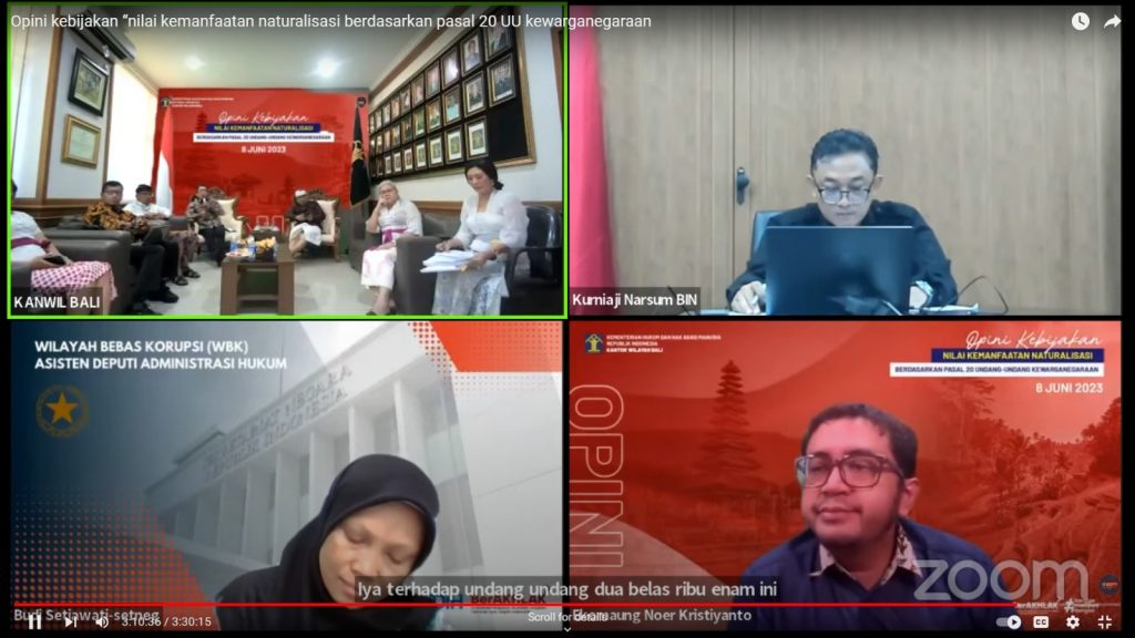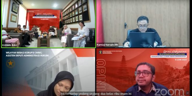 DENPASAR, Patrolibali _ Kantor Wilayah Kemenkumham Bali bekerja sama dengan Badan Strategi Kebijakan Hukum dan HAM (BSK Kumham) menyelenggarakan diskusi daring Obrolan Peneliti (Opini) dengan tema “Nilai kemanfaatan Naturalisasi Berdasarkan Pasal 20 Undang-Undang Kewarganegaraan”, Kamis (08/06/2023).