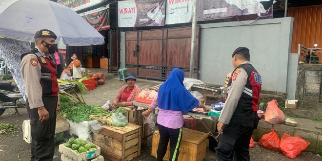 Tabanan, Patrolibali _ Sebagai upaya mencegah terjadinya gangguan kamtibmas di wilayah hukum Polres Tabanan, Satuan Samapta melakukan patroli terhadap pasar dan tempat keramaian yang ada di kota Tabanan, seperti pada hari minggu tanggal 11 Juni 2023 pagi, tampak personil Satuan Samapta melakukan patroli memasuki pasar tradisional Dauh Pala – Tabanan.