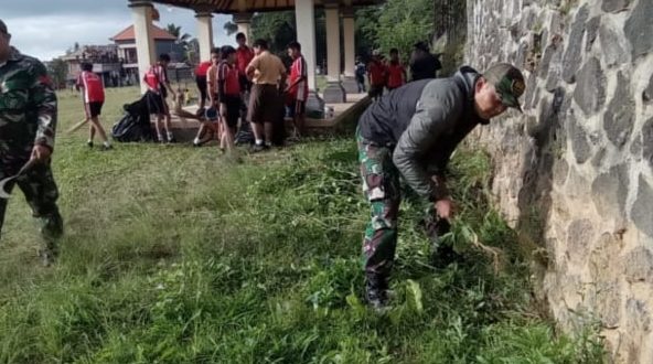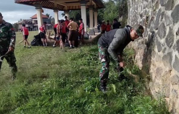 TABANAN, Patrolibali – Menjelang Hari Ulang Tahun (HUT) Kemerdekaan RI yang Ke-78 Tahun 2023. Personel Koramil 1619-07/Baturiti yang dipimpin Bintara Tinggi Urusan Dalam (Batituud) Pelda I Wayan Gunaryana ajak seluruh personel dan warga masyarakat berserta siswa siswi SD sekecamatan Baturiti melaksanakan kerja bakti secara serentak di lingkungan disekitar lapangan umum Baturiti Kecamatan Baturiti Kab. Tabanan, kamis (28/7/2023).