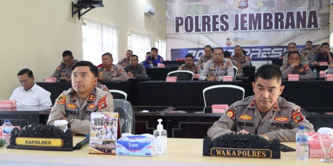 Jembrana, Patrolibali – Bertempat di Aula Mapolres, Kapolres Jembrana AKBP I Dewa Gde Juliana, S.H., S.I.K., M.I.K. yang didampingi oleh Wakapolres Jembrana, dan seluruh PJU beserta Kapolsek jajaran menghadiri kegiatan sosialisasi Program Quick Wins Presisi TW III T.A. 2023 secara virtual melalui zoom meeting, Selasa (1/8/2023) pukul 11.00 Wita.
