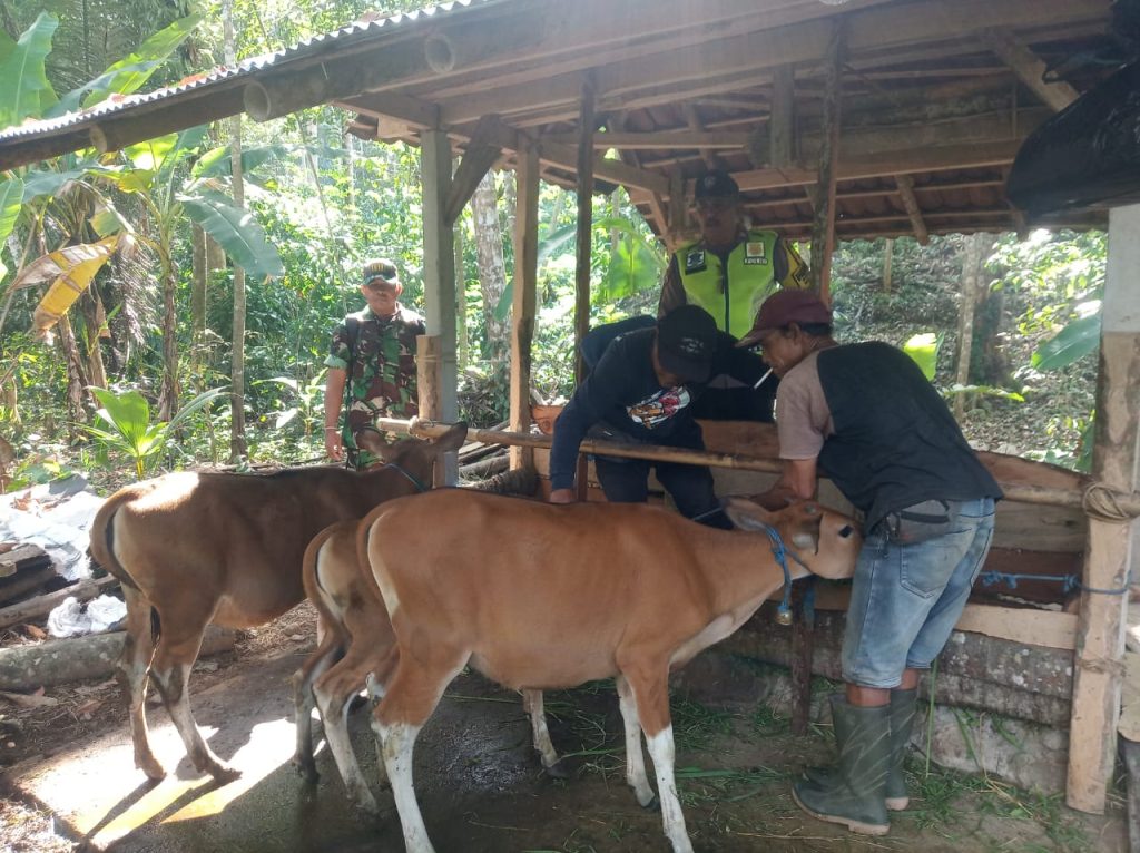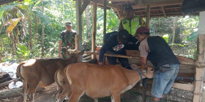 TABANAN , Patrolibali – Sebagai upaya mencegah dan memberantas penyakit menular pada hewan ternak, Babinsa Koramil 1619-08/penebel Serka I Made Duduk dampingi petugas UPDT Kesehatan Hewan I Tabanan memberikan vaksin pada hewan ternak warga guna mengantisipasi penyebaran Penyakit Mulut dan Kuku (PMK) di Desa Jegu Kec. Penebel, Senin (4/9/2023)