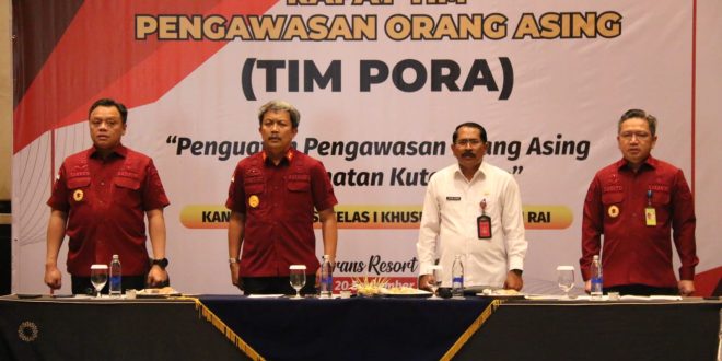 BADUNG,Patrolibali – Kantor Imigrasi Kelas I Khusus TPI Ngurah Rai menggelar Rapat Tim Pengawasan Orang Asing (Tim PORA) dengan tema “Penguatan Pengawasan Orang Asing di Kecamatan Kuta Utara” pada hari Rabu, 20 September 2023. Acara ini digelar di Trans Hotel Resort dan dihadiri oleh Kepala Kantor Wilayah Kementerian Hukum dan Hak Asasi Manusia (Kemenkumham) Bali, Anggiat Napitupulu, Kepala Divisi Keimigrasian Barron Ichsan, Kepala Kantor Imigrasi Kelas I TPI Khusus Ngurah Rai, Sugito, Pejabat Administrasi pada jajaran Kanwil Kemenkumham Bali dan Kantor Imigrasi Kelas I Khusus TPI Ngurah Rai, berbagai pemangku kepentingan yang tergabung dalam anggota Tim PORA diantaranya Jajaran Forkopimda Kabupaten Badung, serta Camat dan Kepala Desa di Kecamatan Kuta Utara.
