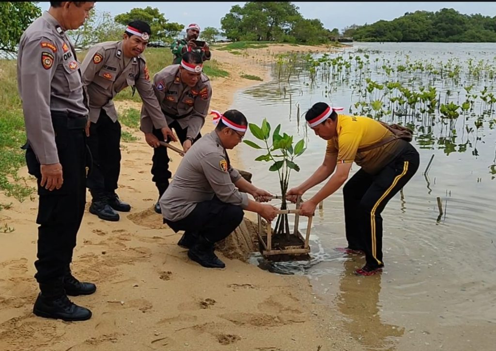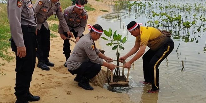 Polri Peduli Lingkungan Penanaman Mangrove Di Pulau Pudut Memperingati Hari Bhayangkara Ke- 78