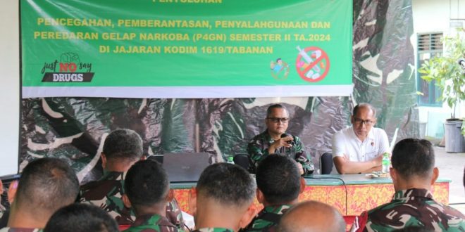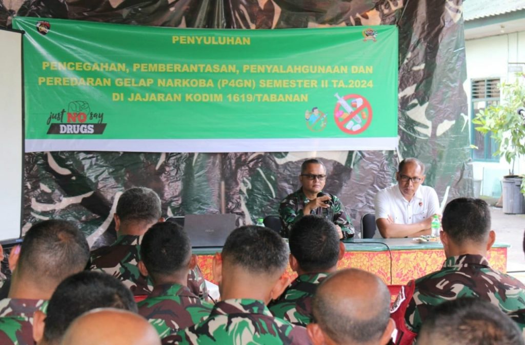 Media Patrolibali, TABANAN Komando Distrik Militer (Kodim) 1619/Tabanan, menggelar kegiatan Sosialisasi Pencegahan Pemberantasan Penyalahgunaan dan Peredaran Gelap Narkoba (P4GN) Semester II TA. 2024 dengan narasumber dari BNK Kab. Tabanan a.n. AKP Kadek Darmawan, bagi Prajurit, dan PNS di halaman Makodim 1619/Tabanan, Rabu (13/11/2024).