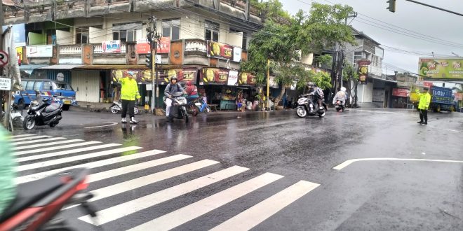 Media Patrolibali, Tabanan – Bajera, Meski diguyur hujan, tak menurunkan semangat personel Polsek Selemadeg Polres Tabanan dipimpin Iptu I Gusti Made Airmanta selaku Padal untuk melaksanakan pengaturan lalu lintas atau strong point di titik keramaian potensi laka lantas. Kamis, (12/03/23). Pkl. 06:30 Wita.