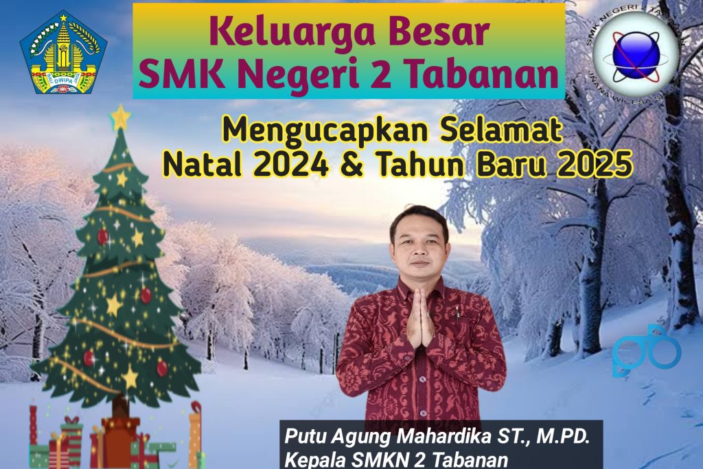 SMK Negeri 2 Tabanan Mengucapkan Selamat Natal 2024 & Tahun Baru 2025. Rudi Desember 23, 2024 BERITA, PENDIDIKAN Leave a comment 52 Views Related Articles Selamat Hari Raya Galungan Dan Kuningan, 19 – 29 November 2025 6 jam ago Sambut HUT Kota Singasana ke-532, Koramil Kerambitan Turun Tangan dalam Aksi Gerebek Sampah 5 hari ago Polda Bali Gencar Awasi Harga Beras, 2 Toko di Denpasar Terjaring Razia 2 minggu ago Share Facebook Twitter Stumbleupon LinkedIn Pinterest