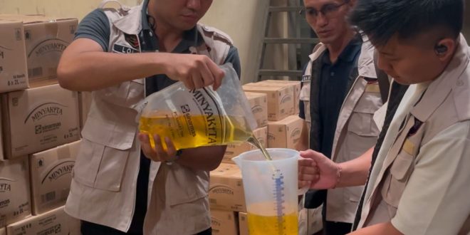 Dibawah komando AKBP Wiliam Sitorus S.I.K., Kasubdit I Ditreskrimsus Polda Bali, para personil mengecek takaran dan harga jual tertinggi (HET) Minyakita yang diambil secara acak sebagai sempel pengecekan ukur takaran menggunakan gelas takar.