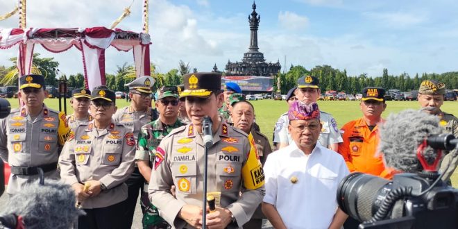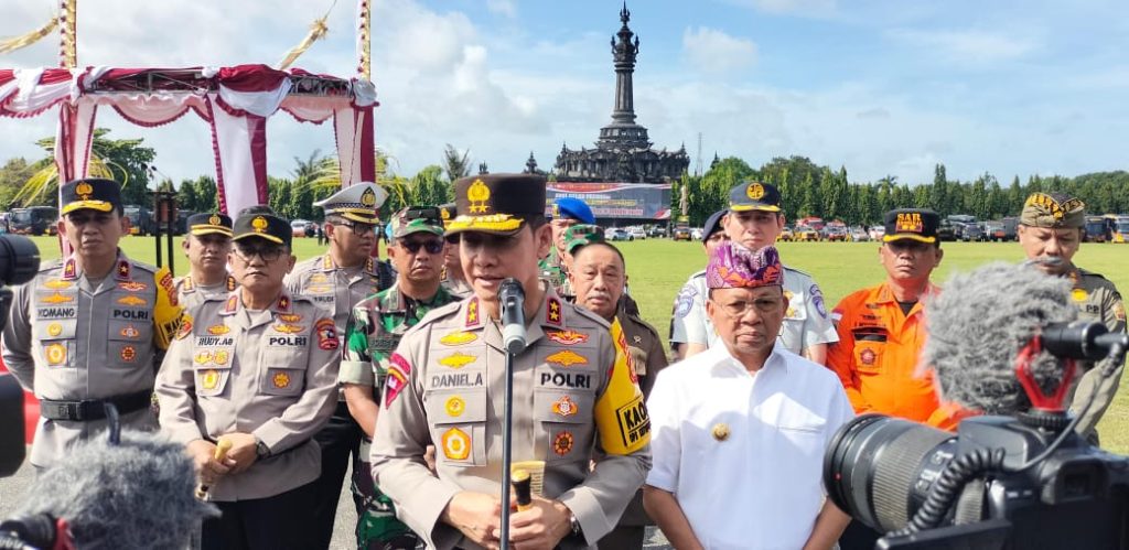 Media Patrolibali, Denpasar – Saat doorstop didepan para awak media setelah pelaksanaan gelar pasukan Ops Ketupat Agung-2025 dilapangan nitimandala renon Denpasar, Kapolda Bali Irjen Pol Daniel Adityajaya S.I.K., M.Si., didampingi Gubernur Bali Ir. Wayan Koster M.M., Waka Polda Brigjen Pol I Komang Sandi Arsana S.I.K., M.H., serta Forkopimda lainnya, kamis 20/3/2025.