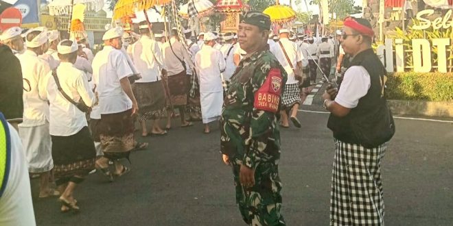 Media Patrolibali, Tabanan – Dalam rangka menjaga kelancaran dan keamanan pelaksanaan upacara adat Melasti, Babinsa Desa Wanasari Koramil 1619-01/Tabanan