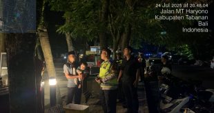 Media Patrolibali, Polda Bali – Polres Tabanan – Humas Tabanan, Kamis, 24 Juli 2025.Gabungan Piket Fungsi Tunjukkan Kehadiran Polisi untuk Wujudkan Rasa Aman di Tengah Masyarakat.Guna menjaga stabilitas keamanan di wilayah hukum Polres Tabanan pada malam hari, gabungan piket fungsi melaksanakan Blue Light Patrol dengan menyasar lokasi-lokasi yang berpotensi menimbulkan …