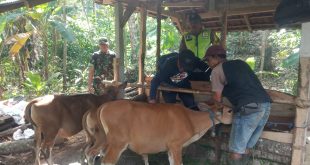 TABANAN , Patrolibali – Sebagai upaya mencegah dan memberantas penyakit menular pada hewan ternak, Babinsa Koramil 1619-08/penebel Serka I Made Duduk dampingi petugas UPDT Kesehatan Hewan I Tabanan memberikan vaksin pada hewan ternak warga guna mengantisipasi penyebaran Penyakit Mulut dan Kuku (PMK) di Desa Jegu Kec. Penebel, Senin (4/9/2023) Seusai …