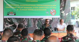 Media Patrolibali, TABANAN– Komando Distrik Militer (Kodim) 1619/Tabanan, menggelar kegiatan Sosialisasi Pencegahan Pemberantasan Penyalahgunaan dan Peredaran Gelap Narkoba (P4GN) Semester II TA. 2024 dengan narasumber dari BNK Kab. Tabanan a.n. AKP Kadek Darmawan, bagi Prajurit, dan PNS di halaman Makodim 1619/Tabanan, Rabu (13/11/2024). Dalam kesempatan tersebut Dandim 1619/Tabanan Letkol Inf …